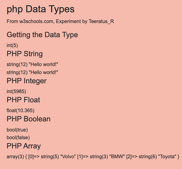 <h2>php Data Types</h2> <p>From w3schools.com, Experiment by Teeratus_R </p> <h4>Getting the Data Type</h4> <?php // The PHP var_dump() function returns the data type and value: $x = 5; var_dump($x); ?> <h4>PHP String</h4> <?php $x = "Hello world!"; $y = 'Hello world!'; var_dump($x); echo "<br>"; var_dump($y); ?> <h4>PHP Integer</h4> <?php $x = 5985; var_dump($x); ?> <h4>PHP Float</h4> <?php $x = 10.365; var_dump($x); ?> <h4>PHP Boolean</h4> <?php $x = true; $y = false; var_dump($x); echo "<br>"; var_dump($y); ?> <h4>PHP Array</h4> <?php $cars = array("Volvo", "BMW", "Toyota"); var_dump($cars); ?>