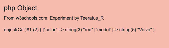 <h4>php Object</h4> <p>From w3schools.com, Experiment by Teeratus_R </p> <?php class Car { public $color; public $model; public function __construct($color, $model) { $this->color = $color; $this->model = $model; } public function message() { return "My car is a " . $this->color . " " . $this->model . "!"; } } $myCar = new Car("red", "Volvo"); var_dump($myCar); ?>