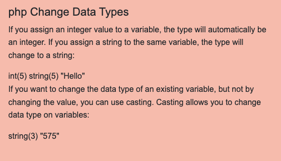 <h4>php Change Data Types</h4> <p>If you assign an integer value to a variable, the type will automatically be an integer. If you assign a string to the same variable, the type will change to a string:</p> <?php $x = 5; var_dump($x); $x = "Hello"; var_dump($x); ?> <p>If you want to change the data type of an existing variable, but not by changing the value, you can use casting. Casting allows you to change data type on variables:</p> <?php $x = 575; $x = (string) $x; var_dump($x); ?>