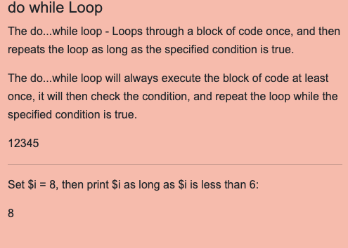 <p>The do...while loop will always execute the block of code at least once, it will then check the condition, and repeat the loop while the specified condition is true.</p>