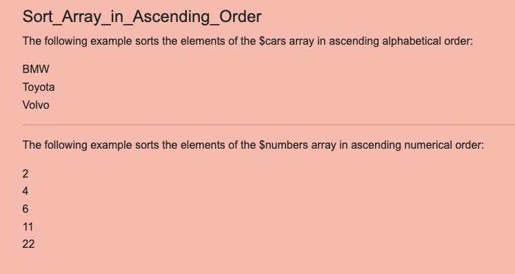 The following example sorts the elements of the $cars array in ascending alphabetical order: