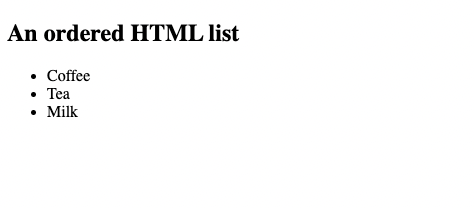 <!DOCTYPE html> <html> <body> <h2>An ordered HTML list</h2> <ul> <li>Coffee</li> <li>Tea</li> <li>Milk</li> </ul> </body> </html>