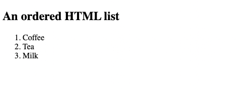 An ordered list starts with the <ol> tag. Each list item starts with the <li> tag.