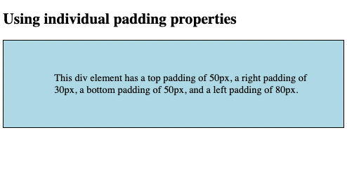 <div>This div element has a top padding of 50px, a right padding of 30px, a bottom padding of 50px, and a left padding of 80px.</div>