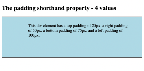 <div>This div element has a top padding of 25px, a right padding of 50px, a bottom padding of 75px, and a left padding of 100px.</div>