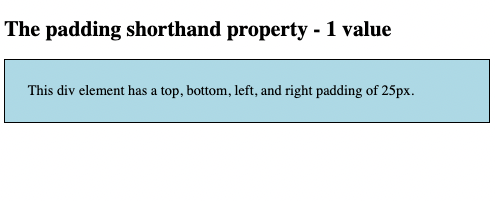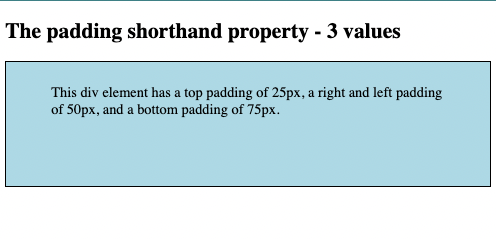 <div>This div element has a top padding of 25px, a right and left padding of 50px, and a bottom padding of 75px.</div>