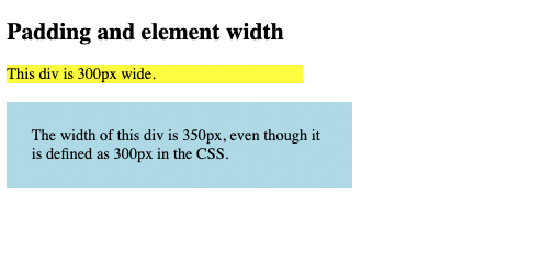 Here, the <div> element is given a width of 300px. However, the actual width of the <div> element will be 350px (300px + 25px of left padding + 25px of right padding):