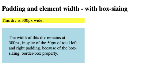 <div class="ex2">The width of this div remains at 300px, in spite of the 50px of total left and right padding, because of the box-sizing: border-box property.