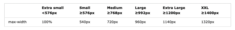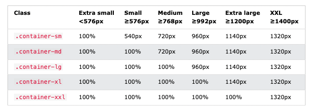 <div class="container-sm">.container-sm</div> <div class="container-md">.container-md</div> <div class="container-lg">.container-lg</div> <div class="container-xl">.container-xl</div> <div class="container-xxl">.container-xxl</div>