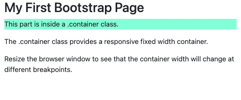 <!DOCTYPE html> <html lang="en"> <head> <title>Bootstrap Example</title> <meta charset="utf-8"> <meta name="viewport" content="width=device-width, initial-scale=1"> <link href="https://cdn.jsdelivr.net/npm/bootstrap@5.1.3/dist/css/bootstrap.min.css" rel="stylesheet"> <script src="https://cdn.jsdelivr.net/npm/bootstrap@5.1.3/dist/js/bootstrap.bundle.min.js"></script> <style> #a1 { background-color: aquamarine; } </style> </head> <body> <div class="container"> <h1>My First Bootstrap Page</h1> <p id="a1">This part is inside a .container class.</p> <p>The .container class provides a responsive fixed width container.</p> <p>Resize the browser window to see that the container width will change at different breakpoints.</p> </div> </body> </html>