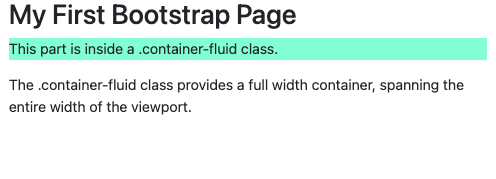 <!DOCTYPE html> <html lang="en"> <head> <title>Bootstrap Example</title> <meta charset="utf-8"> <meta name="viewport" content="width=device-width, initial-scale=1"> <link href="https://cdn.jsdelivr.net/npm/bootstrap@5.1.3/dist/css/bootstrap.min.css" rel="stylesheet"> <script src="https://cdn.jsdelivr.net/npm/bootstrap@5.1.3/dist/js/bootstrap.bundle.min.js"></script> <style> #a1 { background-color: aquamarine; } </style> </head> <body> <div class="container-fluid"> <h1>My First Bootstrap Page</h1> <p id="a1">This part is inside a .container-fluid class.</p> <p>The .container-fluid class provides a full width container, spanning the entire width of the viewport.</p> </div> </body> </html>
