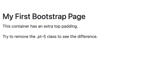 <!DOCTYPE html> <html lang="en"> <head> <title>Bootstrap Example</title> <meta charset="utf-8"> <meta name="viewport" content="width=device-width, initial-scale=1"> <link href="https://cdn.jsdelivr.net/npm/bootstrap@5.1.3/dist/css/bootstrap.min.css" rel="stylesheet"> <script src="https://cdn.jsdelivr.net/npm/bootstrap@5.1.3/dist/js/bootstrap.bundle.min.js"></script> </head> <body> <div class="container pt-5"> <h1>My First Bootstrap Page</h1> <p>This container has an extra top padding.</p> <p>Try to remove the .pt-5 class to see the difference.</p> </div> </body> </html>