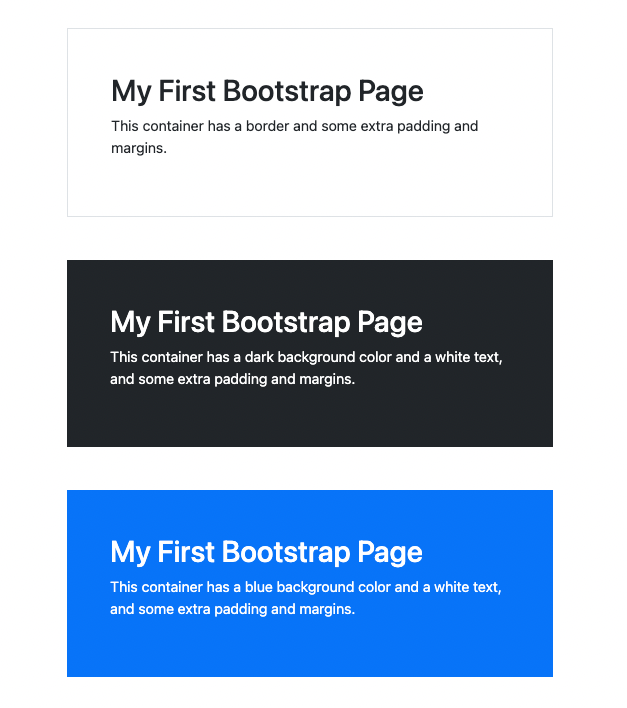 <!DOCTYPE html> <html lang="en"> <head> <title>Bootstrap Example</title> <meta charset="utf-8"> <meta name="viewport" content="width=device-width, initial-scale=1"> <link href="https://cdn.jsdelivr.net/npm/bootstrap@5.1.3/dist/css/bootstrap.min.css" rel="stylesheet"> <script src="https://cdn.jsdelivr.net/npm/bootstrap@5.1.3/dist/js/bootstrap.bundle.min.js"></script> </head> <body> <div class="container p-5 my-5 border"> <h1>My First Bootstrap Page</h1> <p>This container has a border and some extra padding and margins.</p> </div> <div class="container p-5 my-5 bg-dark text-white"> <h1>My First Bootstrap Page</h1> <p>This container has a dark background color and a white text, and some extra padding and margins.</p> </div> <div class="container p-5 my-5 bg-primary text-white"> <h1>My First Bootstrap Page</h1> <p>This container has a blue background color and a white text, and some extra padding and margins.</p> </div> </body> </html>
