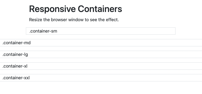<!DOCTYPE html> <html lang="en"> <head> <title>Bootstrap Example</title> <meta charset="utf-8"> <meta name="viewport" content="width=device-width, initial-scale=1"> <link href="https://cdn.jsdelivr.net/npm/bootstrap@5.1.3/dist/css/bootstrap.min.css" rel="stylesheet"> <script src="https://cdn.jsdelivr.net/npm/bootstrap@5.1.3/dist/js/bootstrap.bundle.min.js"></script> </head> <body> <div class="container pt-3"> <h1>Responsive Containers</h1> <p>Resize the browser window to see the effect.</p> </div> <div class="container-sm border">.container-sm</div> <div class="container-md mt-3 border">.container-md</div> <div class="container-lg mt-3 border">.container-lg</div> <div class="container-xl mt-3 border">.container-xl</div> <div class="container-xxl mt-3 border">.container-xxl</div> </body> </html>