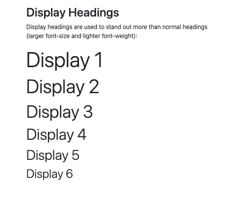Display headings are used to stand out more than normal headings (larger font-size and lighter font-weight), and there are six classes to choose from: .display-1 to .display-6: