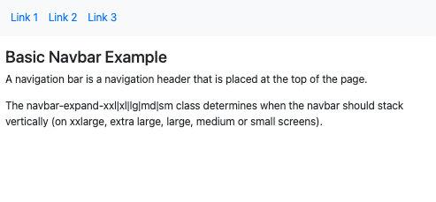 <!DOCTYPE html> <html lang="en"> <head> <title>Bootstrap Example</title> <meta charset="utf-8"> <meta name="viewport" content="width=device-width, initial-scale=1"> <link href="https://cdn.jsdelivr.net/npm/bootstrap@5.1.3/dist/css/bootstrap.min.css" rel="stylesheet"> <script src="https://cdn.jsdelivr.net/npm/bootstrap@5.1.3/dist/js/bootstrap.bundle.min.js"></script> </head> <body> <nav class="navbar navbar-expand-sm bg-light"> <div class="container-fluid"> <ul class="navbar-nav"> <li class="nav-item"> <a class="nav-link" href="#">Link 1</a> </li> <li class="nav-item"> <a class="nav-link" href="#">Link 2</a> </li> <li class="nav-item"> <a class="nav-link" href="#">Link 3</a> </li> </ul> </div> </nav> <div class="container-fluid mt-3"> <h3>Basic Navbar Example</h3> <p>A navigation bar is a navigation header that is placed at the top of the page.</p> <p>The navbar-expand-xxl|xl|lg|md|sm class determines when the navbar should stack vertically (on xxlarge, extra large, large, medium or small screens).</p> </div> </body> </html>