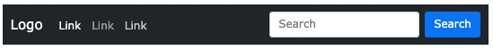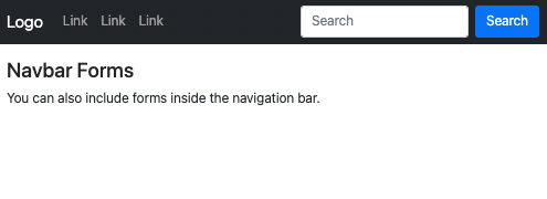 <!DOCTYPE html> <html lang="en"> <head> <title>Bootstrap Example</title> <meta charset="utf-8"> <meta name="viewport" content="width=device-width, initial-scale=1"> <link href="https://cdn.jsdelivr.net/npm/bootstrap@5.1.3/dist/css/bootstrap.min.css" rel="stylesheet"> <script src="https://cdn.jsdelivr.net/npm/bootstrap@5.1.3/dist/js/bootstrap.bundle.min.js"></script> </head> <body> <nav class="navbar navbar-expand-sm navbar-dark bg-dark"> <div class="container-fluid"> <a class="navbar-brand" href="javascript:void(0)">Logo</a> <button class="navbar-toggler" type="button" data-bs-toggle="collapse" data-bs-target="#mynavbar"> <span class="navbar-toggler-icon"></span> </button> <div class="collapse navbar-collapse" id="mynavbar"> <ul class="navbar-nav me-auto"> <li class="nav-item"> <a class="nav-link" href="javascript:void(0)">Link</a> </li> <li class="nav-item"> <a class="nav-link" href="javascript:void(0)">Link</a> </li> <li class="nav-item"> <a class="nav-link" href="javascript:void(0)">Link</a> </li> </ul> <form class="d-flex"> <input class="form-control me-2" type="text" placeholder="Search"> <button class="btn btn-primary" type="button">Search</button> </form> </div> </div> </nav> <div class="container-fluid mt-3"> <h3>Navbar Forms</h3> <p>You can also include forms inside the navigation bar.</p> </div> </body> </html>