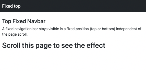 <!DOCTYPE html> <html lang="en"> <head> <title>Bootstrap Example</title> <meta charset="utf-8"> <meta name="viewport" content="width=device-width, initial-scale=1"> <link href="https://cdn.jsdelivr.net/npm/bootstrap@5.1.3/dist/css/bootstrap.min.css" rel="stylesheet"> <script src="https://cdn.jsdelivr.net/npm/bootstrap@5.1.3/dist/js/bootstrap.bundle.min.js"></script> </head> <body style="height:1500px"> <nav class="navbar navbar-expand-sm bg-dark navbar-dark fixed-top"> <div class="container-fluid"> <a class="navbar-brand" href="#">Fixed top</a> </div> </nav> <div class="container-fluid" style="margin-top:80px"> <h3>Top Fixed Navbar</h3> <p>A fixed navigation bar stays visible in a fixed position (top or bottom) independent of the page scroll.</p> <h1>Scroll this page to see the effect</h1> </div> </body> </html>