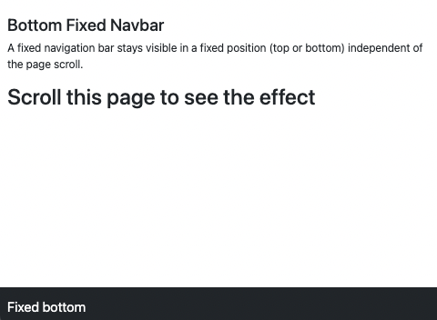 <!DOCTYPE html> <html lang="en"> <head> <title>Bootstrap Example</title> <meta charset="utf-8"> <meta name="viewport" content="width=device-width, initial-scale=1"> <link href="https://cdn.jsdelivr.net/npm/bootstrap@5.1.3/dist/css/bootstrap.min.css" rel="stylesheet"> <script src="https://cdn.jsdelivr.net/npm/bootstrap@5.1.3/dist/js/bootstrap.bundle.min.js"></script> </head> <body style="height:1500px"> <nav class="navbar navbar-expand-sm bg-dark navbar-dark fixed-bottom"> <div class="container-fluid"> <a class="navbar-brand" href="#">Fixed bottom</a> </div> </nav> <div class="container-fluid"><br> <h3>Bottom Fixed Navbar</h3> <p>A fixed navigation bar stays visible in a fixed position (top or bottom) independent of the page scroll.</p> <h1>Scroll this page to see the effect</h1> </div> </body> </html>