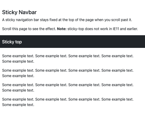 <!DOCTYPE html> <html lang="en"> <head> <title>Bootstrap Example</title> <meta charset="utf-8"> <meta name="viewport" content="width=device-width, initial-scale=1"> <link href="https://cdn.jsdelivr.net/npm/bootstrap@5.1.3/dist/css/bootstrap.min.css" rel="stylesheet"> <script src="https://cdn.jsdelivr.net/npm/bootstrap@5.1.3/dist/js/bootstrap.bundle.min.js"></script> </head> <body style="height:1500px"> <div class="container-fluid mt-3"> <br> <h3>Sticky Navbar</h3> <p>A sticky navigation bar stays fixed at the top of the page when you scroll past it.</p> <p>Scroll this page to see the effect. <strong>Note:</strong> sticky-top does not work in IE11 and earlier.</p> </div> <nav class="navbar navbar-expand-sm bg-dark navbar-dark sticky-top"> <div class="container-fluid"> <a class="navbar-brand" href="#">Sticky top</a> </div> </nav> <div class="container-fluid"><br> <p>Some example text. Some example text. Some example text. Some example text. Some example text.</p> <p>Some example text. Some example text. Some example text. Some example text. Some example text.</p> <p>Some example text. Some example text. Some example text. Some example text. Some example text.</p> <p>Some example text. Some example text. Some example text. Some example text. Some example text.</p> </div> </body> </html>