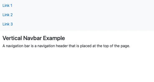 <!DOCTYPE html> <html lang="en"> <head> <title>Bootstrap Example</title> <meta charset="utf-8"> <meta name="viewport" content="width=device-width, initial-scale=1"> <link href="https://cdn.jsdelivr.net/npm/bootstrap@5.1.3/dist/css/bootstrap.min.css" rel="stylesheet"> <script src="https://cdn.jsdelivr.net/npm/bootstrap@5.1.3/dist/js/bootstrap.bundle.min.js"></script> </head> <body> <nav class="navbar bg-light"> <div class="container-fluid"> <ul class="navbar-nav"> <li class="nav-item"> <a class="nav-link" href="#">Link 1</a> </li> <li class="nav-item"> <a class="nav-link" href="#">Link 2</a> </li> <li class="nav-item"> <a class="nav-link" href="#">Link 3</a> </li> </ul> </div> </nav> <div class="container-fluid mt-3"> <h3>Vertical Navbar Example</h3> <p>A navigation bar is a navigation header that is placed at the top of the page.</p> </div> </body> </html>