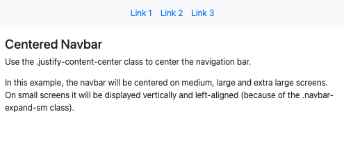 <!DOCTYPE html> <html lang="en"> <head> <title>Bootstrap Example</title> <meta charset="utf-8"> <meta name="viewport" content="width=device-width, initial-scale=1"> <link href="https://cdn.jsdelivr.net/npm/bootstrap@5.1.3/dist/css/bootstrap.min.css" rel="stylesheet"> <script src="https://cdn.jsdelivr.net/npm/bootstrap@5.1.3/dist/js/bootstrap.bundle.min.js"></script> </head> <body> <nav class="navbar navbar-expand-sm bg-light justify-content-center"> <ul class="navbar-nav"> <li class="nav-item"> <a class="nav-link" href="#">Link 1</a> </li> <li class="nav-item"> <a class="nav-link" href="#">Link 2</a> </li> <li class="nav-item"> <a class="nav-link" href="#">Link 3</a> </li> </ul> </nav> <div class="container-fluid mt-3"> <h3>Centered Navbar</h3> <p>Use the .justify-content-center class to center the navigation bar.</p> <p>In this example, the navbar will be centered on medium, large and extra large screens. On small screens it will be displayed vertically and left-aligned (because of the .navbar-expand-sm class).</p> </div> </body> </html>