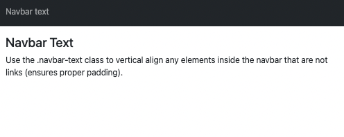 <!DOCTYPE html> <html lang="en"> <head> <title>Bootstrap Example</title> <meta charset="utf-8"> <meta name="viewport" content="width=device-width, initial-scale=1"> <link href="https://cdn.jsdelivr.net/npm/bootstrap@5.1.3/dist/css/bootstrap.min.css" rel="stylesheet"> <script src="https://cdn.jsdelivr.net/npm/bootstrap@5.1.3/dist/js/bootstrap.bundle.min.js"></script> </head> <body> <nav class="navbar navbar-expand-sm bg-dark navbar-dark"> <div class="container-fluid"> <span class="navbar-text">Navbar text</span> </div> </nav> <div class="container-fluid mt-3"> <h3>Navbar Text</h3> <p>Use the .navbar-text class to vertical align any elements inside the navbar that are not links (ensures proper padding).</p> </div> </body> </html>