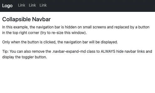 <!DOCTYPE html> <html lang="en"> <head> <title>Bootstrap Example</title> <meta charset="utf-8"> <meta name="viewport" content="width=device-width, initial-scale=1"> <link href="https://cdn.jsdelivr.net/npm/bootstrap@5.1.3/dist/css/bootstrap.min.css" rel="stylesheet"> <script src="https://cdn.jsdelivr.net/npm/bootstrap@5.1.3/dist/js/bootstrap.bundle.min.js"></script> </head> <body> <nav class="navbar navbar-expand-sm bg-dark navbar-dark"> <div class="container-fluid"> <a class="navbar-brand" href="#">Logo</a> <button class="navbar-toggler" type="button" data-bs-toggle="collapse" data-bs-target="#collapsibleNavbar"> <span class="navbar-toggler-icon"></span> </button> <div class="collapse navbar-collapse" id="collapsibleNavbar"> <ul class="navbar-nav"> <li class="nav-item"> <a class="nav-link" href="#">Link</a> </li> <li class="nav-item"> <a class="nav-link" href="#">Link</a> </li> <li class="nav-item"> <a class="nav-link" href="#">Link</a> </li> </ul> </div> </div> </nav> <div class="container-fluid mt-3"> <h3>Collapsible Navbar</h3> <p>In this example, the navigation bar is hidden on small screens and replaced by a button in the top right corner (try to re-size this window).</p> <p>Only when the button is clicked, the navigation bar will be displayed.</p> <p>Tip: You can also remove the .navbar-expand-md class to ALWAYS hide navbar links and display the toggler button.</p> </div> </body> </html>