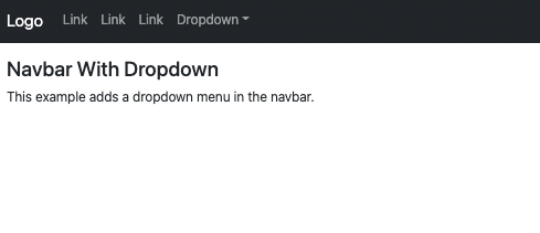 <!DOCTYPE html> <html lang="en"> <head> <title>Bootstrap Example</title> <meta charset="utf-8"> <meta name="viewport" content="width=device-width, initial-scale=1"> <link href="https://cdn.jsdelivr.net/npm/bootstrap@5.1.3/dist/css/bootstrap.min.css" rel="stylesheet"> <script src="https://cdn.jsdelivr.net/npm/bootstrap@5.1.3/dist/js/bootstrap.bundle.min.js"></script> </head> <body> <nav class="navbar navbar-expand-sm bg-dark navbar-dark"> <div class="container-fluid"> <a class="navbar-brand" href="#">Logo</a> <button class="navbar-toggler" type="button" data-bs-toggle="collapse" data-bs-target="#collapsibleNavbar"> <span class="navbar-toggler-icon"></span> </button> <div class="collapse navbar-collapse" id="collapsibleNavbar"> <ul class="navbar-nav"> <li class="nav-item"> <a class="nav-link" href="#">Link</a> </li> <li class="nav-item"> <a class="nav-link" href="#">Link</a> </li> <li class="nav-item"> <a class="nav-link" href="#">Link</a> </li> <li class="nav-item dropdown"> <a class="nav-link dropdown-toggle" href="#" role="button" data-bs-toggle="dropdown">Dropdown</a> <ul class="dropdown-menu"> <li><a class="dropdown-item" href="#">Link</a></li> <li><a class="dropdown-item" href="#">Another link</a></li> <li><a class="dropdown-item" href="#">A third link</a></li> </ul> </li> </ul> </div> </div> </nav> <div class="container-fluid mt-3"> <h3>Navbar With Dropdown</h3> <p>This example adds a dropdown menu in the navbar.</p> </div> </body> </html>