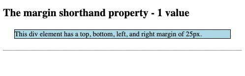<!DOCTYPE html> <html> <head> <style> div { border: 1px solid black; margin: 25px; background-color: lightblue; } </style> </head> <body> <h2>The margin shorthand property - 1 value</h2> <div>This div element has a top, bottom, left, and right margin of 25px.</div> <hr> </body> </html>